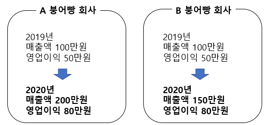 2019년에는 매출액과 영업이익 (원가와 판매관리비 제외한 이익)이 같았지만, 2020년에는 매출액이 A와 B의 매출액이 차이가 납니다.