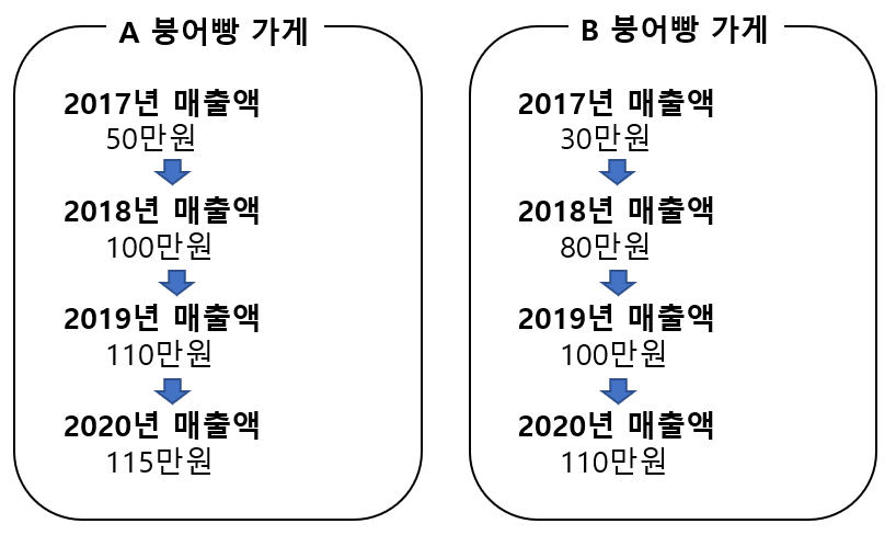 방금 보여드린 자료를 보고 우리가 파악할 수 있는 내용은 A가 B에 비해 매출액이 높고, B는 A에 비해 매출액 상승률이 높다는 점 말고도 모든 붕어빵 가게의 매출액 증가율이 점점 줄고 있다는 것을 알 수 있습니다.