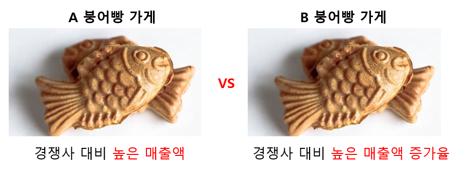 그에 비해 B붕어빵 가게는 왠지 모르지만 A보다 더 높은 매출액 성장률로 A붕어빵 가게를 뒤쫓고 있습니다.(상대적 매출액 상승률 높음)
