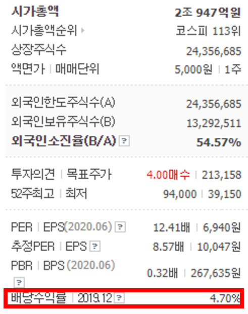 2019년 배당금은 4,050원이었습니다. 이 배당금을 올해도 준다고 가정했을 때 배당수익률은 4.7%입니다.
