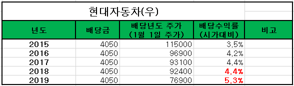 현대차우의 경우 2015년부터 2019년까지 꾸준하게 4,050원의 배당금을 지급한 이력이 있네요.