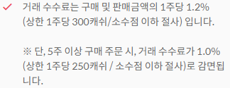 1주 기준 거래금액의 1.2%(상한 300원), 5주 이상 주문시 거래금액의 1%(상한 250원)로 확인할 수 있습니다.