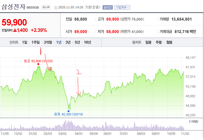 (예시) 아래 그래프에서 볼 수 있듯이, 삼성전자 주식을 만약 1번 지점에서 샀다면, 내 계좌에는 삼성전자 주식 1주, 평균매입단가 60,000원이 적힙니다.