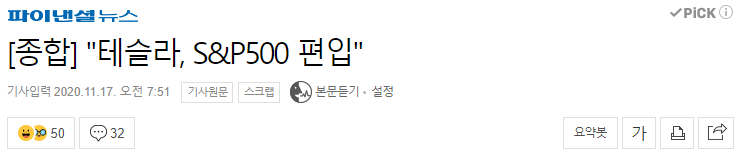 테슬라 주식이 2020년 12월 21일 부터 S&P500 지수에 편입된다는 소식입니다.