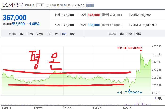 3년 전만해도 엘지화학은 지금과 같이 우상향 그래프가 아닌 코스피 박스권을 제대로 설명해주는 박스권 주가의 왕이었었습니다.