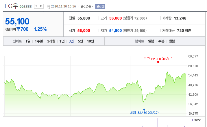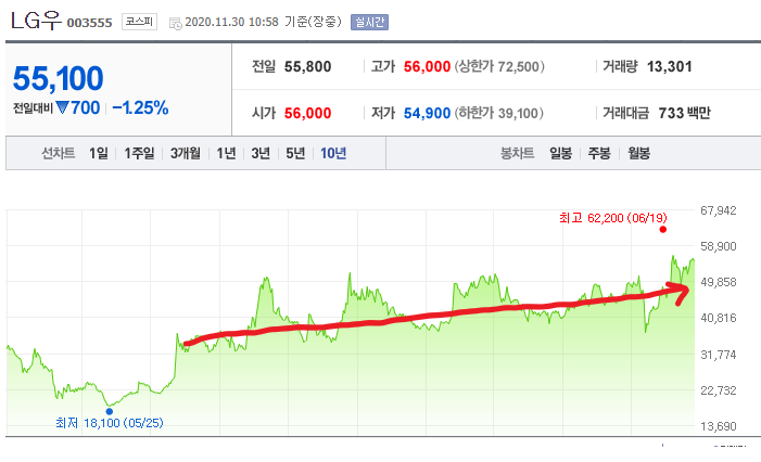 예전 배당주 추천에서도 LG우를 추천했었는데요, 엘지우선주의 경우에 꾸준한 배당금의 증가와 안정적인 주가의 흐름, 그리고 엘지지주사가 갖고 있는 엘지 계열사들의 실적들이 나날이 좋아지고 있기 때문에 주가의 완만한 상승도 이룰수 있다고 생각합니다.
