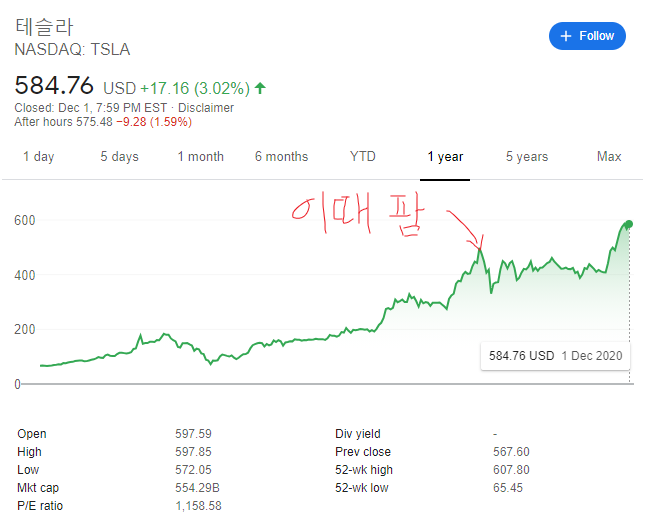 강남 집 값도 이렇겐 못 오를 겁니다.(지난 1년동안 테슬라 주가 10배 상승)