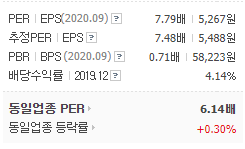 2020년 9월 기준으로 PER가 7~8배 정도로 나옵니다.