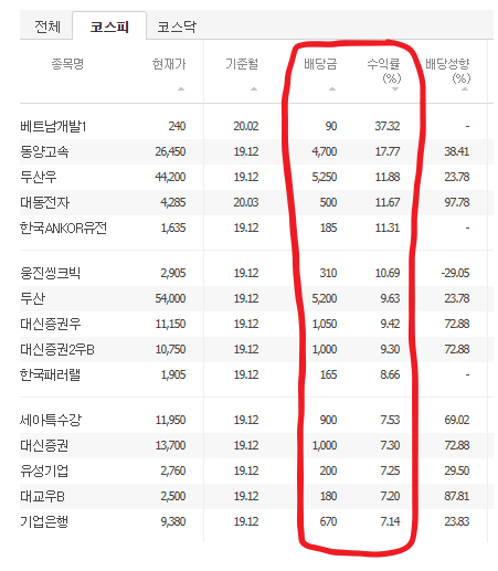 코스피 배당수익률 기준으로 어떤 기업은 37%라는 말도 안되는 수치를 기록하고 있지만, 저건 없다고 쳐도 되는 주식이고, 그 주식을 빼면 연간 10% 가량의 배당수익률을 기록하는 것을 볼 수 있습니다.