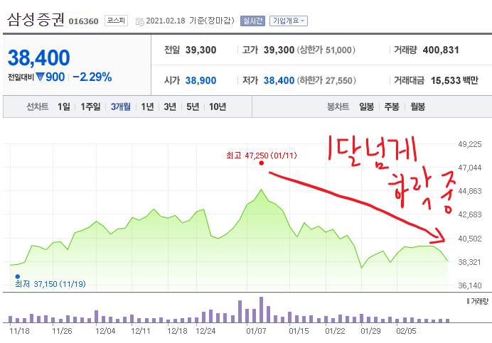 2020년말에 배당을 받기위해 삼성증권을 사셨던 분들이라면 대략 40,000~42,000원대의 평단가를 가질텐데, 대충 5~10%정도 평가손실을 보고 계시리라고 생각됩니다.