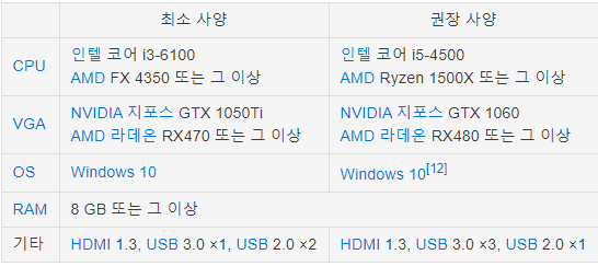 (아래 사양표에서는 그다지 높아보이진 않지만, 고사양이 필요한 콘텐츠들이 꾸준히 나오고 있기 때문에 그 시기에 최고 사양의 그래픽카드와 CPU를 사서 맞추는 것이 좋다고 합니다.)