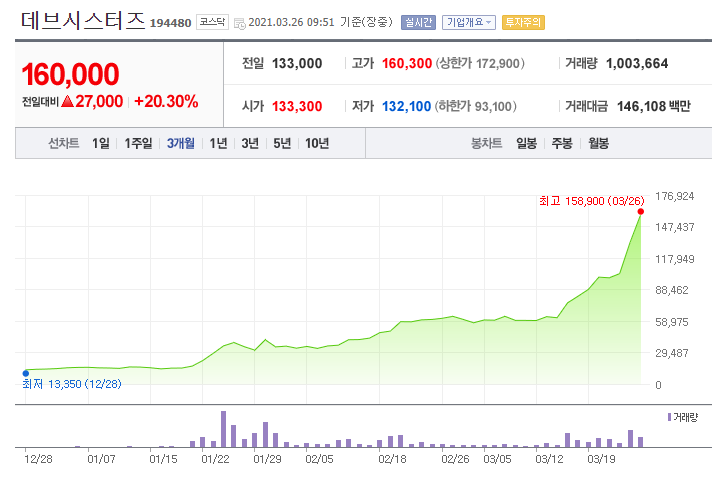 시장에 개미들이 많은 상황에 요즘 바이오 주식의 주가가 무너지고, 코스피도 횡보를 거듭하고 있기에 삼성이나 현대차와 같이 대형 우량주들은 눈길도 안가는 상황에서 변동성을 원하고 상대적으로 주가가 잘 움직이는 '가벼운'주식을 좋아하는 단기투자자금(개미)들의 자금이 데브시스터즈로 빨려들어가고 있습니다.