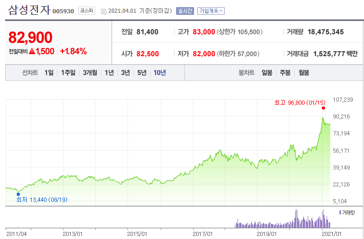 10년전 쯤 삼성이 갤럭시 스마트폰을 만들기 시작한 것 같은데, 그때 가능성을 보고 샀더라면 약 10배정도의 이익을 봤을거라고 생각합니다.