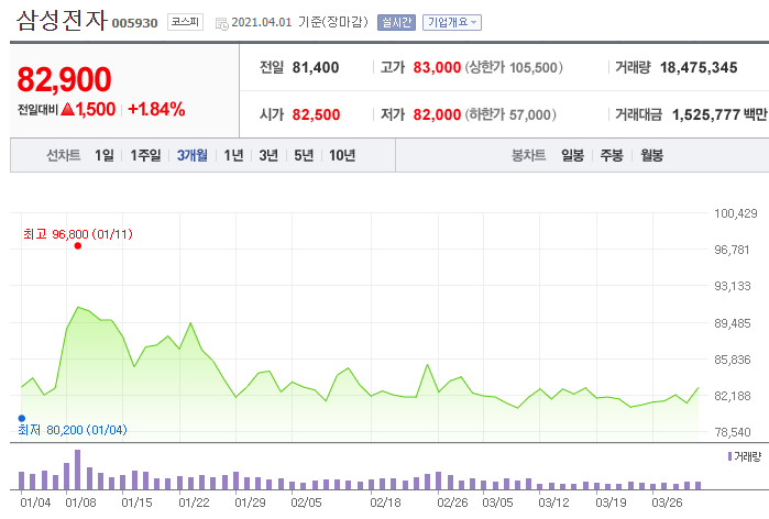 삼성전자 주식은 1월에 10만원을 가는듯 하더니, 현재는 고점에서 약 20%정도 빠져서 8만원대까지 내려온 상황입니다.