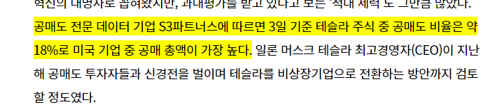테슬라 주식의 공매도 비율은 미국 기업 중에서 가장 높았습니다. 다른 기업의 공매도 비율이 10%정도였다는 것을 보면 거의 2배에 가까운 공매도 비율이었습니다.