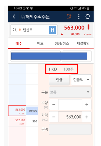 1주에 563홍콩달러이므로 텐센트를 사기 위한 최소금액은 100주 = 56,300 홍콩달러 / 원화 = 8,782,800원 (환율 : 156원/1홍콩달러)