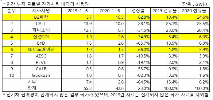 10위권 안에 LG화학, 삼성SDI, SK이노베이션 우리나라의 배터리 3사가 모두 랭크되어있는 것을 보고 전기차 배터리 시장에서의 한국의 위상이 어마어마하구나 하며 국뽕에 취할때쯤 LG화학이 전세계 1위라는 것을 보고 국뽕에 취하다못해 실신할 지경입니다.