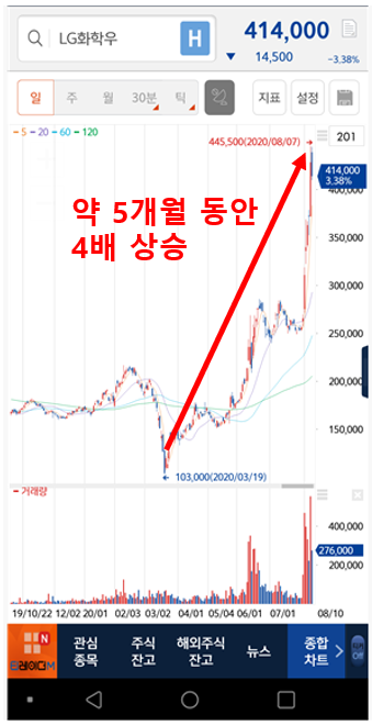 요즘 엘지화학 주가가 2011년 최고점(583,000원)을 기록한 이후로 연일 가파르게 상승하고 있습니다. C19 바이러스 이후 회복국면(?)으로 돌아선 한국 주가시장에서 유독 이 엘지화학 주식에 몰리는